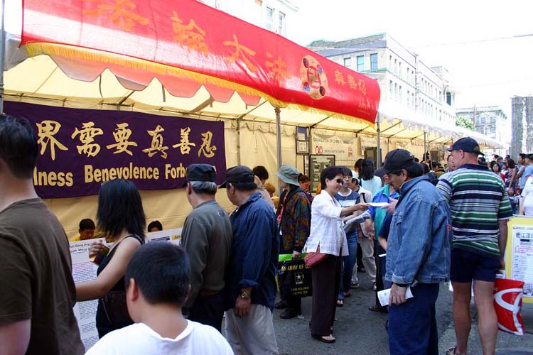 ![]() 法轮功学员表演舞蹈“花仙” | ![]() 学员用英文和广东话介绍了大法在世界的弘传以及在中国发生的镇压迫害。 | ![]() 众多华人驻足观看展板,索取真象资料 |
