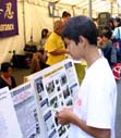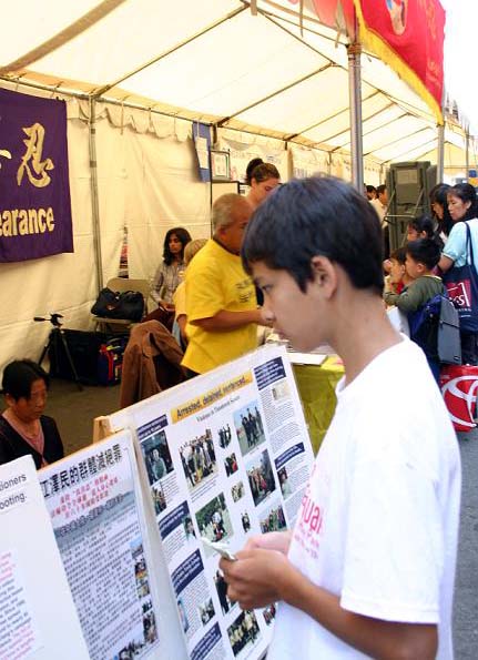 展板前站了三位4至8岁的华人小朋友。最大的那个男孩子指着图片上被迫害的妈妈和8个月的宝宝问大法弟子,这是在说什么?大法弟子告诉他这位妈妈因为修炼法轮功,她和她的孩子被迫害致死,以及在中国的这场迫害。这位小男孩听懂后主动给他的两位小朋友解释。他们拿过资料和光碟说要带回去给父母。