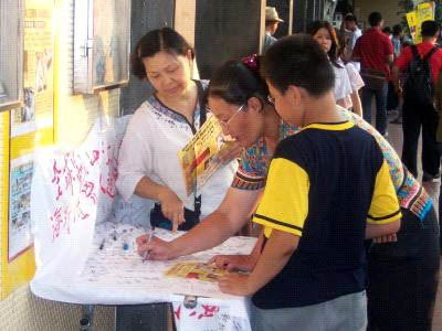 ![]() 签名支持人权,反对江氏集团暴行 | ![]() 仔细聆听签名的原委和法轮功真象的年轻人 | ![]() 一位谦说自己书读不多的民众也签名支持反迫害 |