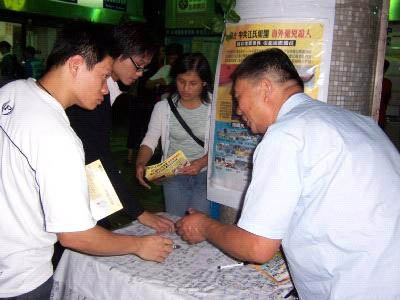 ![]() 母子一同签名 | ![]() 一群学生在了解江氏集团践踏人权后主动签名 | ![]() 向民众解说江氏集团在南非雇凶杀人的暴行 |