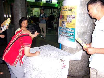 ![]() 一个签名就是一份正义的力量 | ![]() 民众主动签名表达支持维护人权 | ![]() 把真象福音传送给進出车站的旅客 |