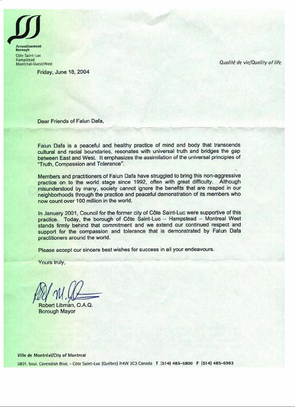 2001年1月,前古圣律克市的市议会对法轮大法给予了支持。今天,古圣律克-汉普斯泰德-西蒙特利尔自治市继续坚定的履行这个承诺。同时,我们也对世界各地法轮大法修炼者们所展现的大善大忍表达我们一贯的尊敬与支持。