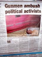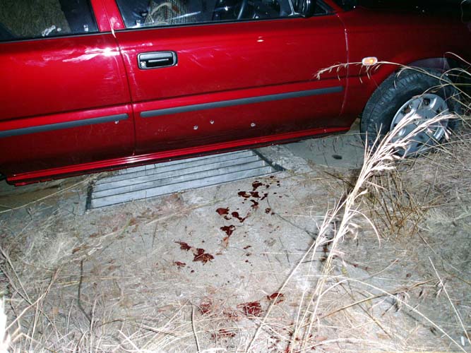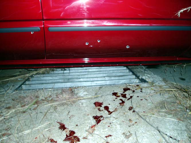 我们的车子被击中了5枪,前右轮胎被打爆,大卫的两脚被击中,右脚被子弹打穿,造成粉碎性骨折,左脚底被打下一部分肉,他当时已经不能正常控制车辆了,腿也被子弹擦伤,我们的车停在黑暗中,大卫的脚很疼,动不了,我们想把他抬出车子,我去抱他的腿,感觉他的脚湿糊糊黏糊糊的,因为天黑,什么也看不清楚,我相信那是流了大量的血,于是我打开箱子拿了一件自己的上衣,裹住了大卫的腿,想让血流的少一点吧,我那时还不知道大卫的脚已被子弹打穿,血是从脚上流出来的,大卫很坚强,没有吭一声,我也顾不上问他疼还是不疼,我们把他抬下了车,他已经不能动了,我们只好把他放平,他躺在草地上,血不断的流着,我们很快截了一辆车将大卫送到医院,在去医院之前,我掏出照相机拍了一些现场照片,在闪光灯的作用下我看清楚了地上的血迹、车上的枪眼儿和车轮胎被打爆的情景。因为着急赶去医院,又十分的匆忙,我只照了一部分。现在回忆当时的情景,十分惊心动魄,又十分幸运,这也是师尊的保护,匪徒的动机是要将我们整车人杀死,造成车毁人亡的自然车祸假象,他们绝对是职业杀手。