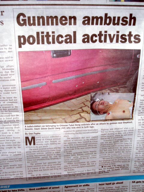 2004年6月28日晚6点,我们抵达南非约翰内斯堡机场,租了两辆轿车前往首都比勒陀利亚(Pretoria)的总统府宾馆(Oresidertid Guest House)進行和平抗议,我们的车辆以120公里的时速在高速公路上行驶,晚8:30时左右,突然一辆浅色轿车从后右侧方追上来,并一路向我们开枪射击,然后在右侧方和我们保持着平行的距离,我们快,他也快,我们慢,他也慢,他们的车子上有4-5个人,我侧过头来看见一个坐在副驾驶座上的黑人,持枪向我们连续射击,我惊呼道:“他们在向我们开枪,大卫快开车!”大卫说:“我的脚很疼,踩不了油门。”我喊了一声“发正念”,这时匪徒将我们的车逼到路边的草丛中,那是马路左侧低势的排水沟。我们的车子被迫停下,匪徒的车也停了几秒钟,然后快速逃走。我们隔日白天察看现场,发现在我们停车前方不到10米处有一个大深水沟,如果我们的车子再往前开一点,就车毁人亡了。