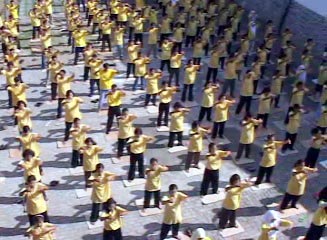 ![]() 上班前职工在学法 | ![]() 上班前职工在炼功 |
