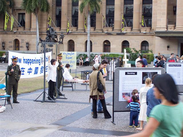 有个年轻人,名叫麦克,他原准备去市中心买音乐光碟,喝点啤酒,轻轻松松的玩一天。可是,看到酷刑展后,他的心情一下子沉重起来,受到了很大的震撼。他仔细的看了介绍,并跟学员长谈。他说:“这个展览冲击着人们的心灵,如果不是这些触目惊心的酷刑展示,我可能就走过去了。你们做得好,就是要强调残酷的现实,让人们了解到这场迫害有多深,有多黑暗!可能我今天一天心情都会很沉重。虽然我并不希望心情沉重,但我宁肯心情沉重,并在你们的征签簿上签名,也不愿意当个无知的糊涂人。”
