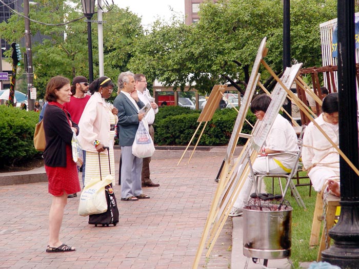 学员们生动的演示打动了参观者的心。观众有的被残酷的现实震惊的目瞪口呆;有的人甚至忍不住掩面痛哭;有的人提出如何帮助中国的法轮功学员;有的人当场向解说的学员学习法轮功功法。