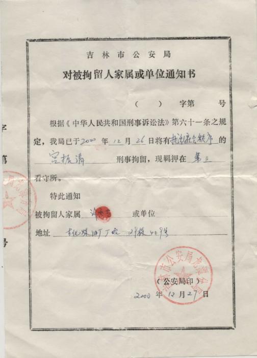 2004年2月下旬,河南省周口市大法弟子宋振灵、王桂金夫妻以及四岁的孩子遭非法绑架。妻子王桂金因怀有身孕被释放,后来又被610办公室命令强行抓捕,其亲朋好友均受到不同程度的迫害。