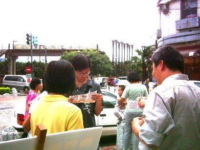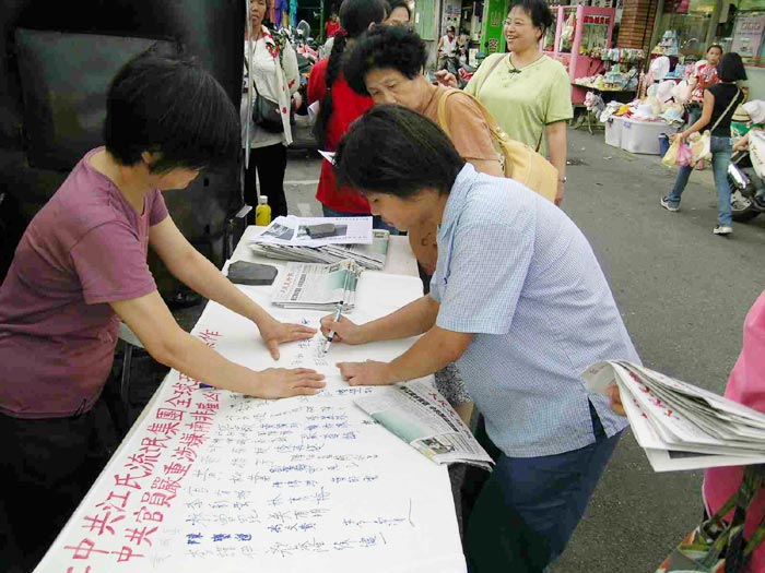有一位先生说他是跑船的,常去大陆,他很清楚情况,那里高压统治,人民没有自由,法轮功炼功锻炼身体很好,但在大陆当初太受欢迎了,太多人炼了,江氏集团就见不得人好,就要铲除你。他觉得大陆很多人很可怜,头脑被洗得很干净,以前6.4天安门杀那么多学生,他拿台湾报纸去给他们看,那些人不相信还说是台湾造假新闻。学员请这位先生再去大陆时别忘了把法轮功真象告诉人们,他说有讲啊!与学员聊完后就马上签名,他说这是维护基本人权,一定要签。