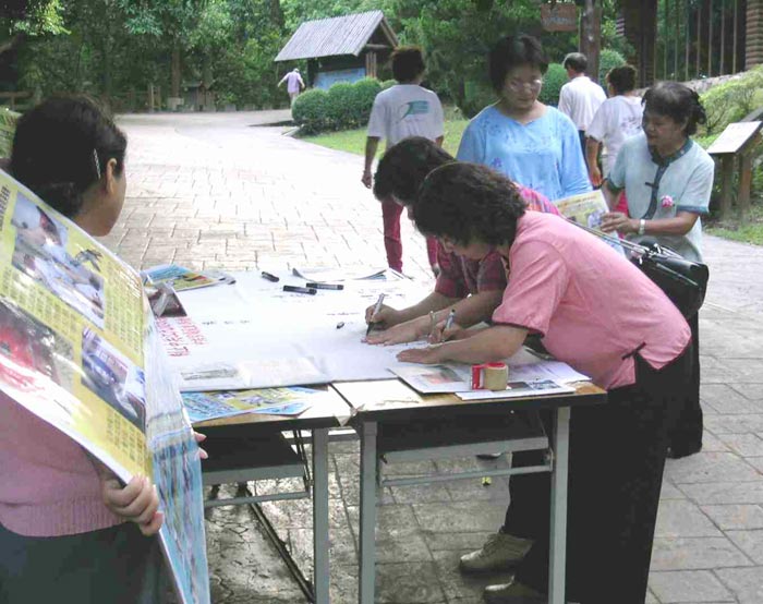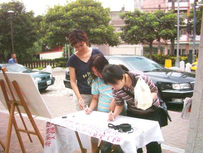 【明慧网2004年7月17日】为了声援二零零四年六月廿八日在南非遭枪击重伤的澳洲法轮功学员,并强烈谴责江氏集团把国家恐怖主义扩张到海外,请善良的人们共同制止江氏集团迫害法轮功的暴行,台湾基隆学员这一周来展开三场征签活动,两天在市区公车循环站下午4:30~7:00的下班时间征签,周六上午基隆郊区学员在著名的景点情人湖洪法炼功和征签,三日下来民众反应热烈,征集大量民众支持。