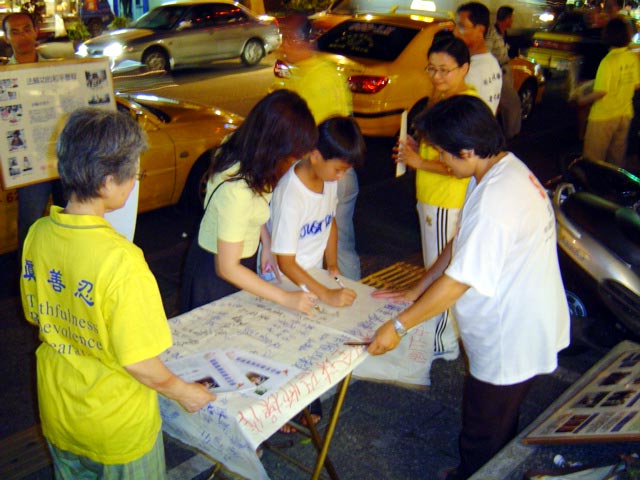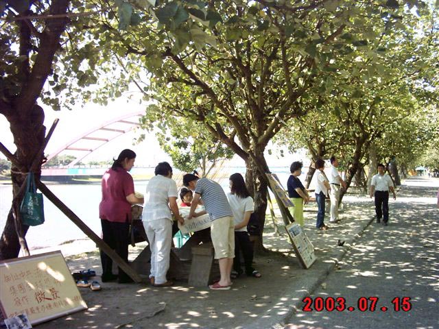自2004年7月11日起连续一周,学员们白天在冬山河亲水公园(国际童玩节) 、晚上在罗东夜市(艺穗节)人潮聚集的地点,征求民众的签名,表达对上述恐怖主义行径的唾弃。学员手持写着“制止江氏集团海外雇凶杀人”的醒目海报 ,有的分发传单简介,向游客讲述法轮功真象与枪击事件始末,希望能为台湾民众发出谴责暴力的正义之声留下历史的见证。