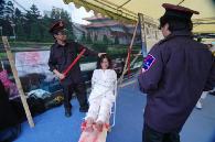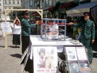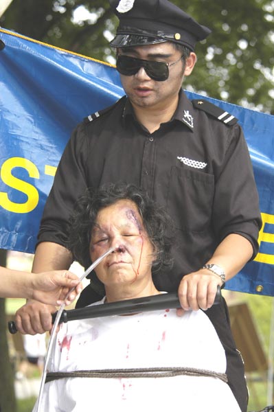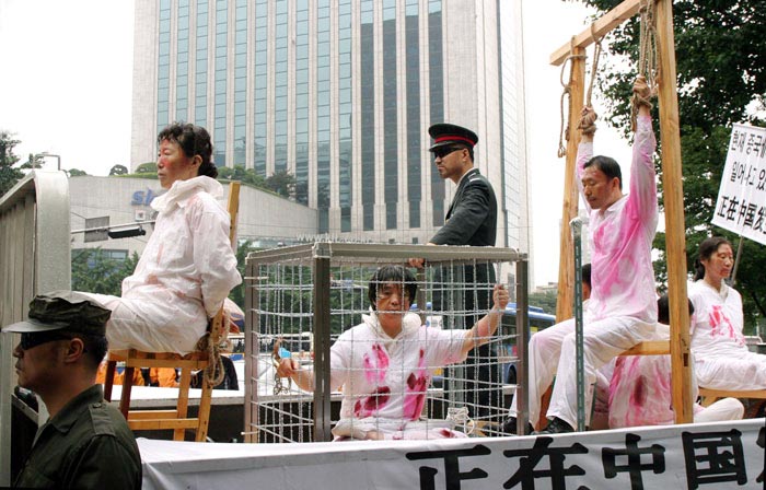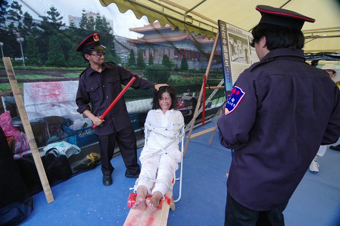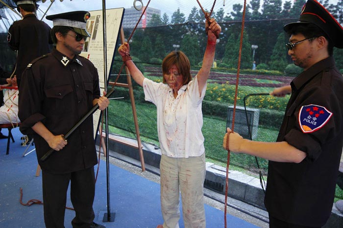 中央社7月17日报道,中国前国家主席江泽民镇压、迫害全球法轮功学员20日届满五周年,台湾法轮大法学会今天下午在中正纪念堂前广场举行纪念活动,同时宣布成立“台湾营救受迫害法轮功学员协会”,以展开控诉和救援行动。纪念会配合图片和摄影推出法轮功真象展,并由真人模拟展示中国迫害法轮功学员的十一种酷刑,包括钉竹签、老虎凳、吊打、注射不明药物、捆刑、烤刑、铐刑、压刑等,闻之令人心惊胆颤、惨不忍睹。