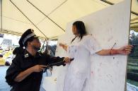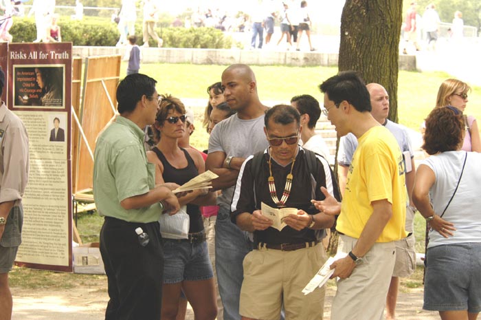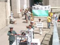 7月17日,旧金山湾区法轮功学员在中国城花园角广场举办正法之路图片展和反酷刑展,揭露江氏集团五年来对修炼真善忍的法轮功学员的迫害。一位老婆婆说每次见到我们都很高兴,主动帮助我们拿图板。一参观展览的观众表示他了解法轮功,他说有一个朋友在公安局做事,如果抓到一个法轮功学员,就会获得2000元的奖金。一位基督徒听了法轮功学员受到的迫害后表示,人是无法战胜神的。