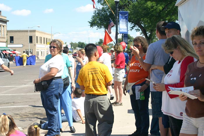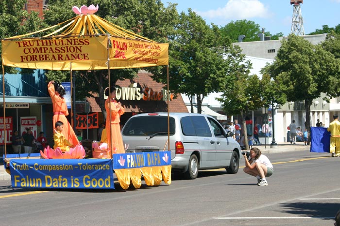【明慧网2004年7月19日】科罗拉多州东部重镇福特摩庚(Fort Morgan)迎来了一年一度的夏季游行。当科罗拉多州的法轮大法学员们汇集在(Fort Morgan) 福特摩庚镇时,晴空万里,镇上的人们特别热情洋溢,在驻足观看的同时,纷纷主动索要法轮大法的真象资料。在游行队伍中,普度音乐,漂亮的花车及功法表演,都赢得了人们的阵阵掌声和欢呼声,并时不时的有人跑上前去照相。也有的人们边看花车功法表演,边模仿着动作。