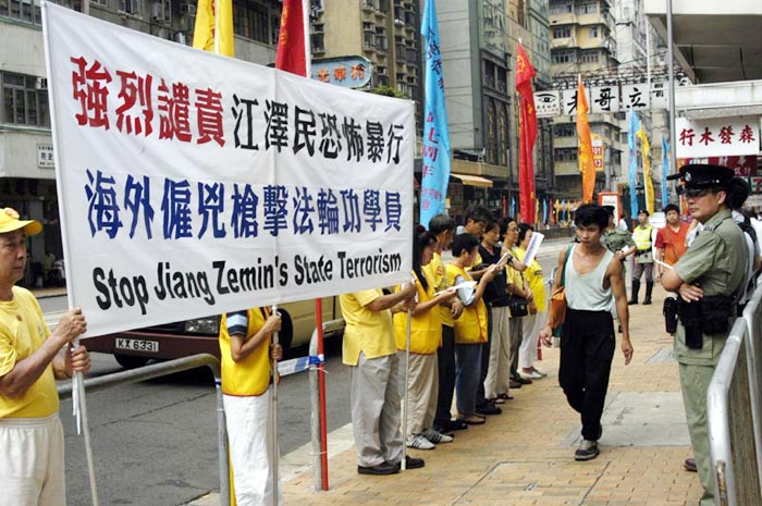 【明慧网2004年7月2日】6月30日上午,数十名香港法轮功学员在中联办外静坐并召开新闻发布会,强烈抗议及谴责江罗集团在南非炮制针对法轮功学员的恐怖枪击暴行。学员并且去到中联办门前宣读严正声明,指出这次事件是江氏集团实行国家恐怖主义,参与恐怖份子活动,采用黑社会手法灭绝人类信仰良知的大曝光,必将遭到全世界爱好和平的正义国家和民众的强烈谴责;并且促请南非政府撤查这次事件的真相,缉拿凶手,抵制江罗集团的黑手向海外延伸;更要求中国当局立即制止江罗集团这种严重败坏国家声誉的野蛮恐怖行为,停止对法轮功的种种形式的,并将犯罪份子绳之以法。