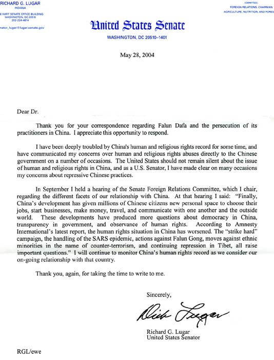 卢格参议员在信中说,长期以来我一直为中国的不良人权与信仰权利记录感到困扰,并曾在许多场合就人权与信仰权在中国受到不当待遇一事直接向中国政府表达我的关注。美国政府不应对中国的人权与信仰权的议题保持缄默。身为美国参议员,我明确的在众多场合里表示我对中国镇压行为的关切。