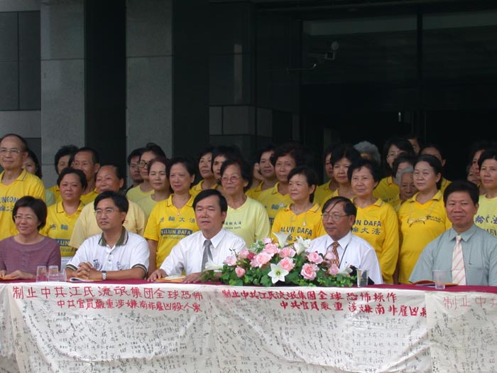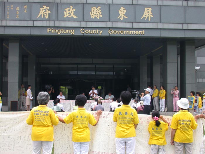 七月十六日,在县政府前广场举行记者会,主题是“制止中共江氏流氓集团全球恐怖操作”,多家地方媒体前来采访报导。屏东县吴应文县长亲自出席,立委、议员、地方士绅多人参加。与会者听完学员针对南非枪击事件的简报后,一致发出正义之声,同声谴责江氏集团的暴行。记者会在学员演唱“请与我比邻而坐”的歌声中,圆满结束。