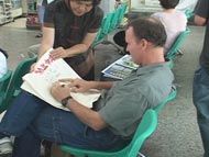 在一所大学校园内征签,有位女士观察学员很久,最后过来表达敬佩之意,她觉得大家好辛苦,并为学员们加油打气。