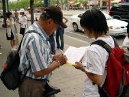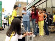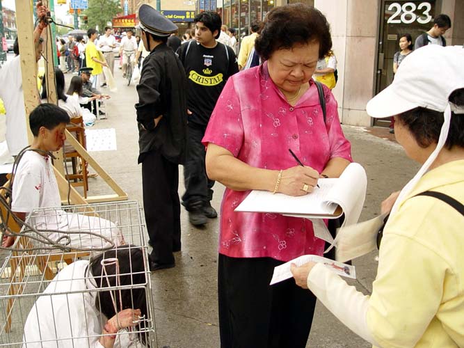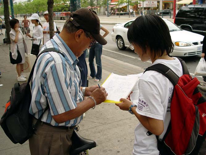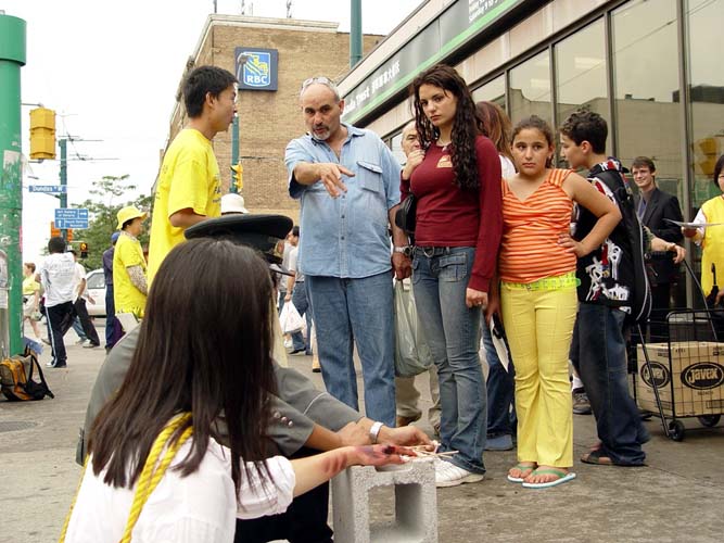 7.20下午,在多伦多中国城最热闹的街头,多伦多法轮功学员演示着五种酷刑:吊打、老虎凳、捆绑、插竹签、蹲铁笼子等。揭露自1999年7月以来江氏集团在中国大陆发起的针对法轮功学员的灭绝群体性的恐怖主义迫害暴行。在人来人往的唐人街中心地带,来往的人络绎不绝,过往的路人无不注目,一批又一批观众驻足观看,人们或索要资料,或讯问情况,了解真象。当很多人了解了这场在光天化日之下发生的残酷迫害之后,不禁惊呼,“居然在今天这个时代还有这样的事情发生。简直不可思议!”人们纷纷签名呼吁停止迫害,要求严惩江泽民。包括那些平时木无表情的华人很多都停下来仔细观看,仔细阅读真象资料,甚至签名表示支持,据一直忙于征集签名的李阿姨说,签名的人络绎不绝,其中三分之一的是华人朋友。酷刑展旁边就有母亲在中国被残酷迫害的学员和在中国亲身遭受过这样迫害的学员在旁现身说法讲真象,但是仍然有受到谎言宣传蒙蔽比较深的华人,说这样的酷刑展是捏造的,在中国不可能发生这样的事情。更让人感到这场迫害的残酷和谎言的欺骗性,任何一个有良知的人都不愿意相信这样的罪恶在今天的阳光下仍然在继续。