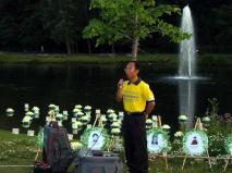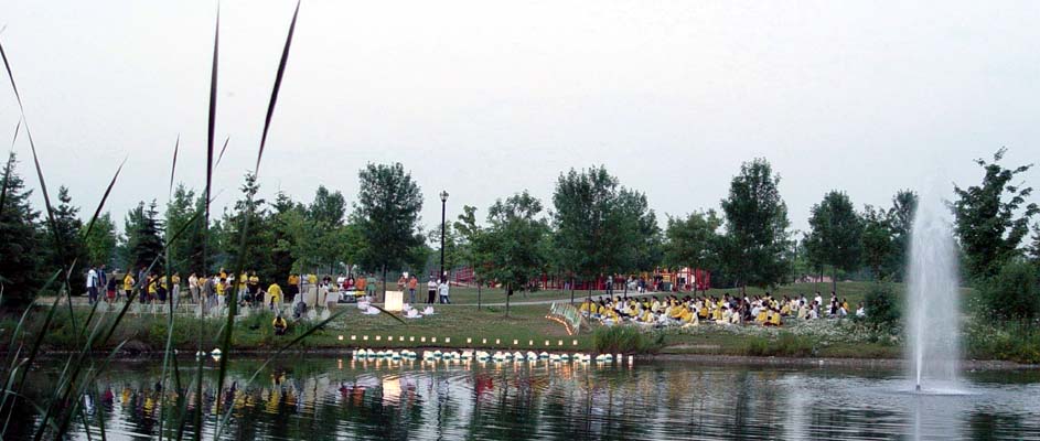 7月19日晚,多伦多学员在市郊士嘉堡的美丽径公园(Milliken Park)举行水灯悼念(把燃点了蜡烛的莲花和灯浮在水上)会,用东方传统的水灯,悼念在中国被迫害致死的千名法轮功学员。几十名来自多伦多各个区的法轮功学员来到郊区幽静,风景优美的美丽径公园举行水灯会悼念。法轮功学员的代表和法轮功之友代表在新闻发布会上发言。