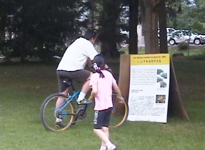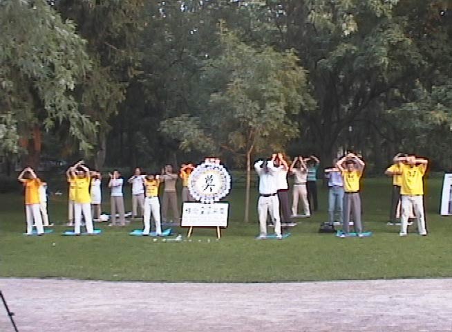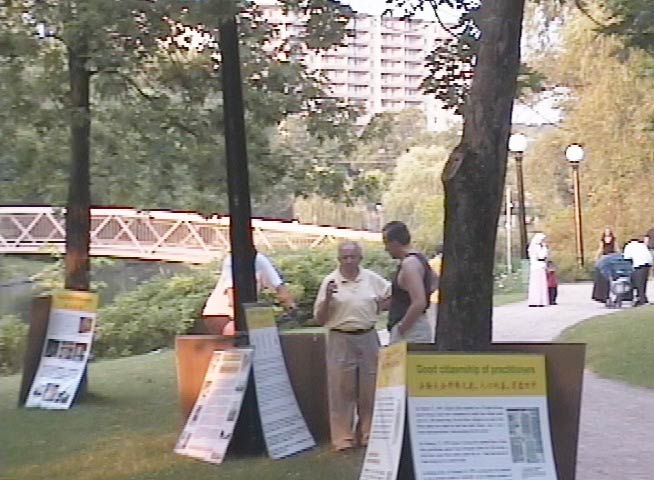 沿着公园小径陈列的真象图片和展板,吸引了散步的人们。他(她)们纷纷驻足,有的目不转睛的注视着学员整齐的炼功动作,有的仔细阅读着真象展板,有的和学员交谈,了解着法轮功和法轮功在中国大陆受到的迫害。