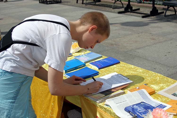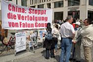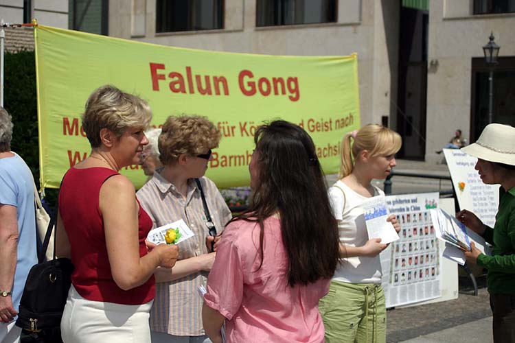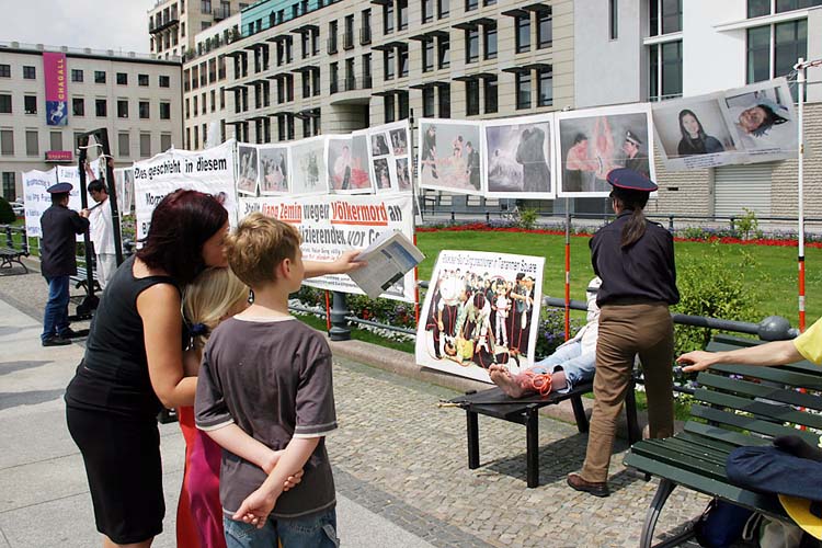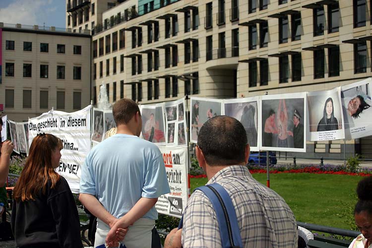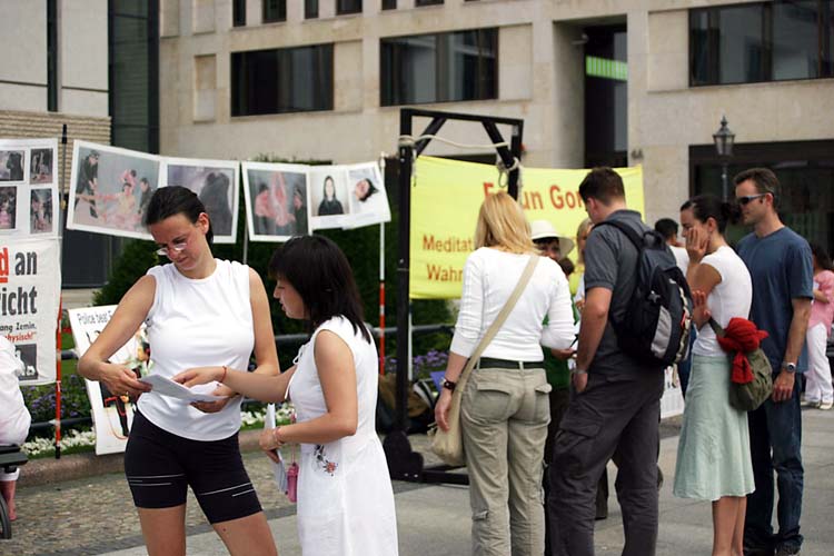 一位来自汉诺维的十来岁的女中学生看着图片便向学员询问更多的真象,她几乎无法相信这样残酷的迫害会在现在的中国发生。她说她要将这个事实告诉她的老师,她要向老师请求让她向她所有的同学介绍这个事实。她希望能立即和在汉诺维的法轮功学员联系,以更多的帮助受迫害的法轮功学员。