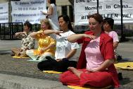 一位年长的德国女士在看过图片后,走到我们的桌边,索取更多的真象资料,她说她立即要将真象资料送给她的牧师朋友,请求她在明天作礼拜时为受迫害的法轮功学员祷告。她还要了一份中文资料,说要将真象告知她的一位中国朋友。酷刑图片让她太震惊,显得有些激动,她不停地指着图片告诉其他人“这完全是纳粹方式”。平静后她向学员要了两朵自制的莲花,表示要为所有被迫害致死的和正在受迫害的学员祈祷。