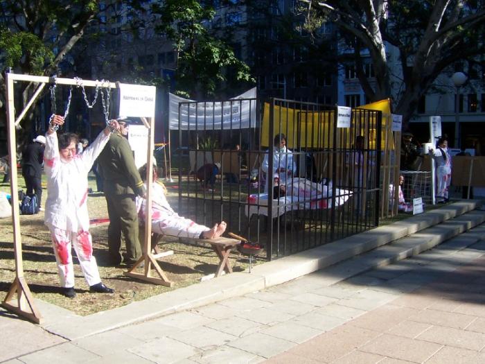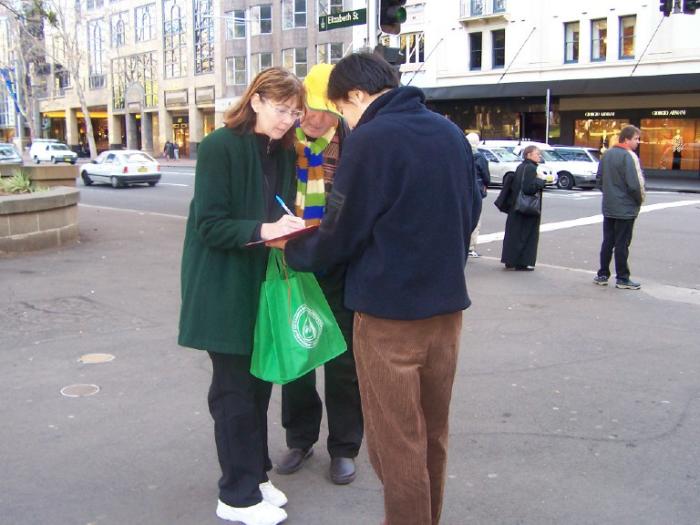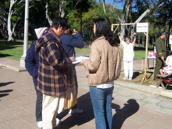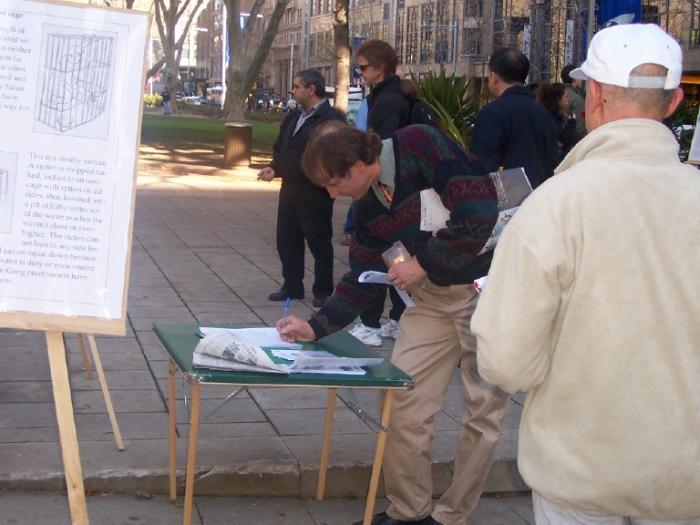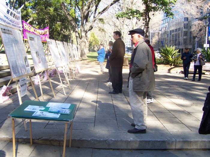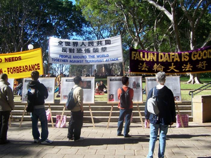 7月20日,为了進一步向广大的澳洲民众揭露江集团的国家恐怖主义暴行,呼吁停止虐杀法轮功学员,悉尼法轮功学员再次于市中心的海德公园举行反酷刑展和图片展。学员在公园的草地和平炼功,同时向过往的行人讲真象和征集谴责江氏南非雇凶企图谋杀法轮功学员的签名。很多行人驻足观看,他们被法轮功学员祥和的炼功场面所吸引,同时他们也被酷刑演示所展现的残暴深深震撼了。行人们主动签名和拿真象资料,并向学员表示了他们对受迫害的法轮功学员的深切同情和对江集团暴行的憎恨与厌恶。