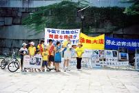 ![]() 法轮功学员们举办展览,支起描述迫害的展板和横幅 |
