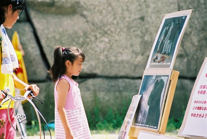 活动后,法轮功学员利用休息的时间交流心得。第二天清晨,来自不同城市的孩子们组成的一个新的队伍,加入到自行车队。他们轮流骑车到达大阪。每次踏动踏板都显出他们的勇气。7月19日下午1:15,队伍抵达大阪城。