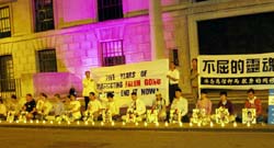 学员们在中使馆外打出了中英文的大横幅,上面分别写有“不屈的灵魂:悼念为信仰而献身的同修”和“立即停止对法轮功五年的迫害”。学员们点燃了一枝枝蜡烛,在路边摆成长长的一行。烛光闪烁,遥寄对为坚持信仰而献身的同修的哀思;整点发正念,清除环宇中邪恶的败物。
