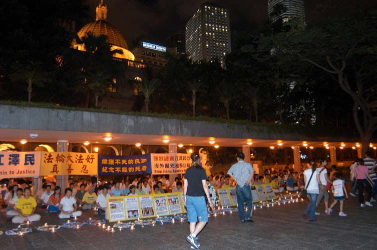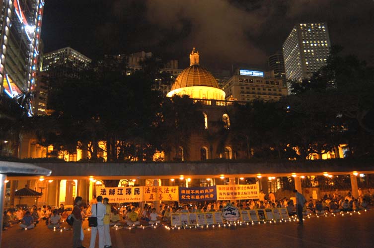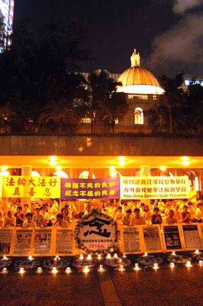 致死的上千名法轮功学员。当天晚上,二百多名香港法轮功学员在中环遮打花园燃起点点烛光,纪念那些为坚持信仰“真善忍”而牺牲生命的同修。