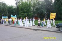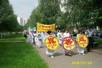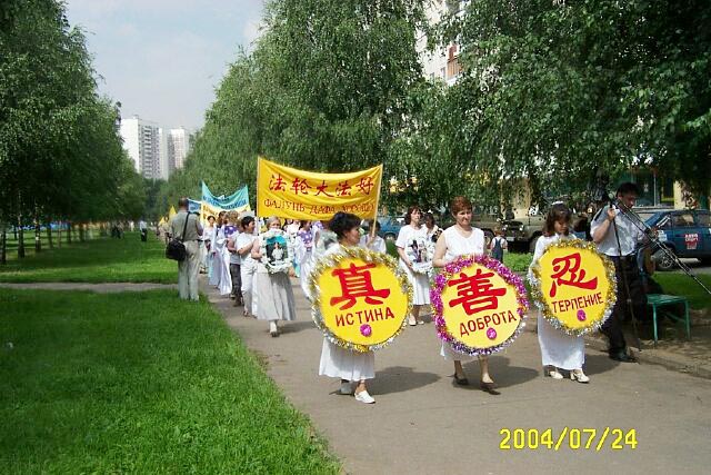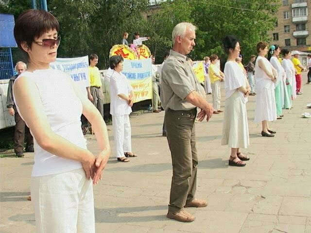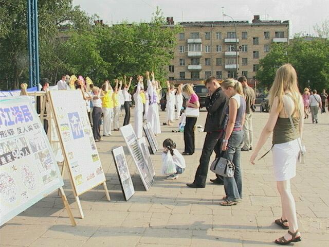 游行队伍到达临近地铁站的闹市区广场。在那里举行了集体炼功、模拟酷刑展、图片展。学员代表还向观众介绍了法轮大法在世界洪传的情况及在中国江氏流氓集团迫害法轮功的真象。年轻学员还为观众表演了舞蹈、唱歌等小型文艺节目。今天是俄罗斯大法学员面对面向莫斯科人讲真象的大型活动,每个大法学员都积极参与,配合默契,整个活动比较成功。特别是广场上的酷刑展震撼了许多莫斯科人。