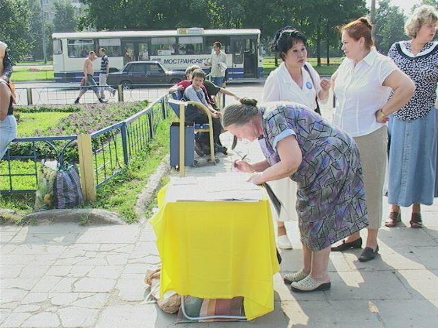 一位俄罗斯老太太走到模拟酷刑展前指着那个演恶警的小伙子:“你为什么把这个老太太吊起来?你怎么能干这坏事儿?快把她放下来。”经过学员耐心向她讲清真象,告诉她这是中国正在发生的事情,我们今天在这里举行活动就是为了制止对善良人的迫害。老太太明白了真象之后就在“支持中国法轮功学员,谴责迫害法轮功”的签名录上签上了自己的名字。