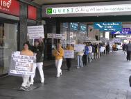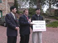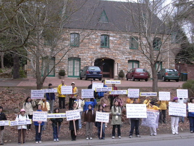 ![]() 新闻发布会中 | ![]() 法轮功学员在唐纳外长的选区办公室外和平请愿 |