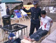 继2004年7月18日和20日在伦敦国会大厦前举办酷刑展之后,英国法轮功学员于7月24-25日在苏格兰首府爱丁堡再次举办真人模拟酷刑展,向世人揭露江氏集团在中国国内残酷迫害法轮功的真象。