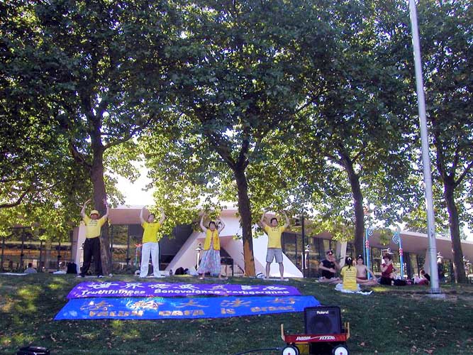 ![]() 在西雅图中心草坪上炼功 | ![]() 来自以色列的母子学炼功法 |