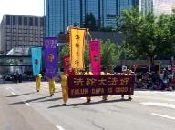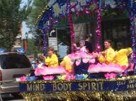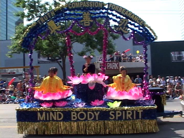 在整个游行中,100A号法轮功学员的游行队伍格外引人注目。游行队伍以巨幅的金色莲花装饰的“法轮大法好”横幅为先导,后面是4位美丽的“绿衣仙子”手捧莲花,翩翩起舞,尽显“荷出绿波”之姿。这群“绿衣仙子”也是整个游行队伍的核心-花车的先导。整个花车以蓝色为背景,金色为前景,紫色的彩带环绕,呈现出“天门”的造型。金色的中英文“真善忍”嵌在这个“天门”的门楣上,表现了法轮功学员坚信真善忍宇宙真理的理念。花车上各色大小莲花点缀其中,四名学员身着金黄色的炼功服坐在四角的4朵大莲花上展示功法,高台上的莲花盘上坐了两个天使般可爱的小弟子,不停的向观看游行的人群挥手致意。整个花车造型别致精巧,庄严而又不失飘逸,在喧嚣的游行队伍中宛如一片祥和的世外桃源。花车后面是六名身着红装的女学员的扇子舞表演,同前面的莲花舞的“荷出绿波”相辉映,颇有“日映朝霞”之态。最后是一个巨大的金色“法轮大法”条幅和四个各种颜色的英文的“法轮大法-真善忍”的条幅“压阵”。