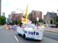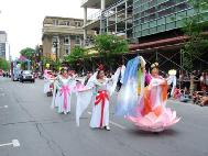 接下来的是红色绒布上绣着“法轮大法”的金字牌匾和大型《转法轮》模型。随后是一辆大型彩车,上面身穿炼功服的8名法轮功学员连续的展示五套功法,一路受到观众的掌声欢迎。当学员合十时,许多观众则恭敬的鞠躬回应。彩车后面是法轮功学员的舞蹈队伍,手持莲花的学员优雅的舞姿为庆祝活动更添喜庆。最后是明慧学校的队伍,小弟子有的穿着胸前绣有法轮图形的服装,有的穿着印有“法轮大法”字样的黄T恤,一直跟着队伍走完全程。