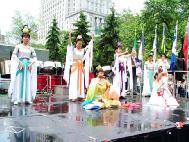在游行的终点,有两家媒体对身着漂亮服装、准备演出的法轮功学员很感兴趣,在得知她们是法轮功修炼者后,记者坚持把旁边穿着法轮大法字样黄T恤的一位男学员拉过来拍照。
