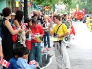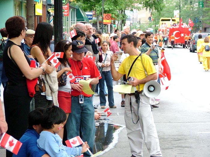 整个游行过程中,学员一直通过音响用英、法文介绍法轮大法的真象。散发资料的学员更是忙得不可开交,有些观众不仅拿一份,还主动为朋友带上几份。其中有许多中国人,打破了以往因受谎言宣传而不敢接受资料的局面。到后来英、法文资料发完后,许多西人甚至索要中文资料,并表示通过查看上面提供的网址,以了解法轮功的内容。