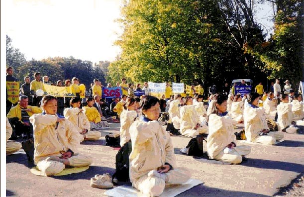 2004年7月20日,匈牙利学员在中国大使馆前举办记者招待会,要求中国立即停止对法轮功学员的迫害,下午大家在 Keletip. u.火车站举办了信息日,大家展示功法,分发真象资料。