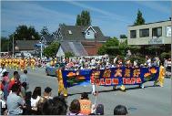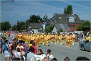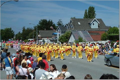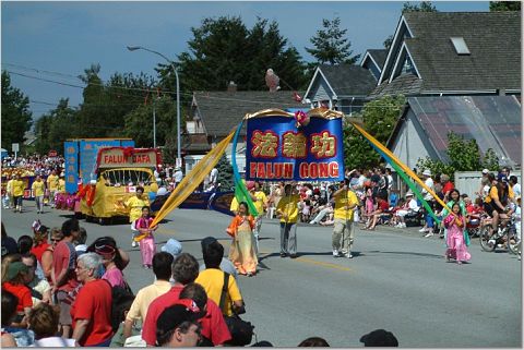 法轮功学员已经是第六年受邀请参加列治文市的7.1游行。列治文市是大温地区华裔大量聚居的城市,游行吸引了众多来自中港台的移民。为了更好的向观众展示法轮大法的美好,此次游行中一改以前的队列安排,分为三个方阵。第一个方阵主题为“法轮功是什么”。首先由崭新的中英文横幅“法轮功”开道,紧接着是中英文“真善忍”横幅,装饰一新的花车紧随其后,车头挂着以绣球装饰的金匾英文“法轮大法”。车身两侧有两个大型展板,上书中英文“法轮大法洪传60多个国家祛病健身修心养性义务教功”,并注有联系电话。花车上有转动的彩色法轮和《转法轮》书的模型,两位“仙女”演示打手印和静功。花车上不停的重复播放着国语、粤语和英语的解说词,让所有的观众都能听到法轮大法的基本情况。其后9名学员组成炼功队伍行進中演示着动功。
