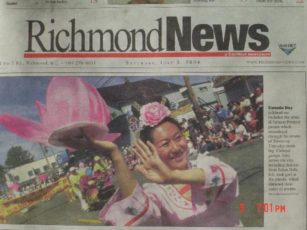 列治文市的英文报纸“Richmond News”头版以图片新闻报道了法轮功学员参加此次游行,还配了一张大照片。