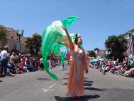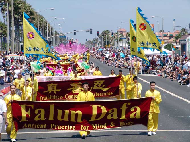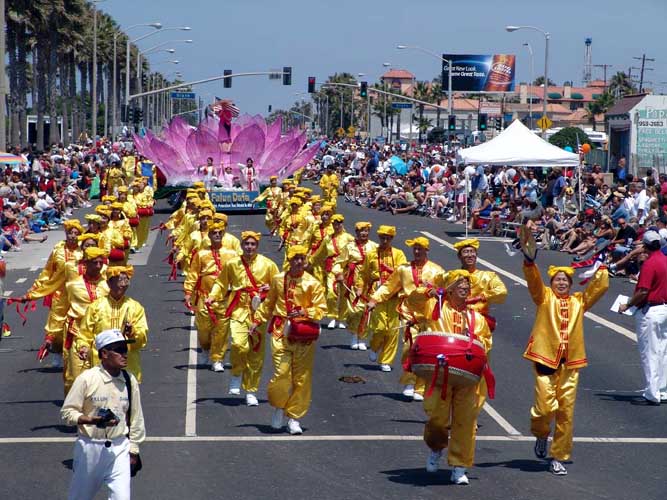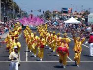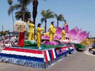 法轮功学员的游行队伍包括标语队、舞蹈队、腰鼓队、花车等部分,是规模较大的游行队伍之一,也是参加游行的唯一一支华人队伍。身着唐装翩翩起舞的仙女、腰鼓队亮丽的黄色服装和整齐划一的动作、花车上盛开的莲花,以及学员们打出的红底金字中英文大横幅“法轮大法”、“真善忍”,在丽日蓝天之下份外醒目。