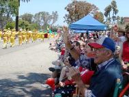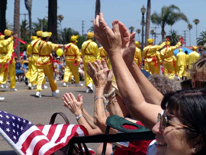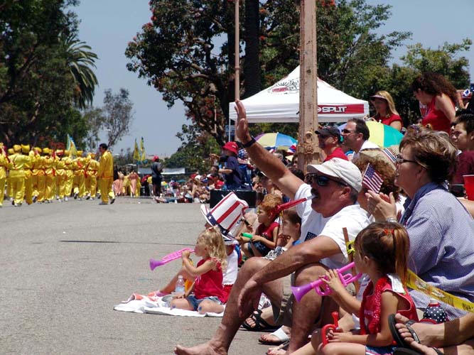 美国人民对法轮功学员与他们共同欢庆节日极为热情,不断为法轮功学员的精彩表演报以热烈的鼓掌欢呼。观众中,有人高喊着刚刚学会的“法轮大法”;有人挥舞着国旗,随着腰鼓队的鼓点手舞足蹈;有人模仿着花车上学员的功法表演,做起了法轮功的动作。人群中不断有人喊着:“太美了!”“真漂亮啊!”一位白人女士兴奋的对着法轮功队伍用中文大喊:“你好!你好!”两位男士乘队伍停下来的机会,站在“法轮大法好”的横幅前留影,并对着横幅鞠躬、作揖;一位维持秩序的警察被优美的功法吸引,找学员询问在哪里可以学功。