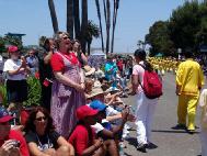 ![]() 许多人忙着拍法轮功游行的照片,图中这位摄影师干脆躺在地上拍照 | ![]() 图中的女士模仿着花车上学员的功法表演,做起了法轮功“贯通两极法”中的“冲灌”动作 | ![]() 散发法轮功传单 |