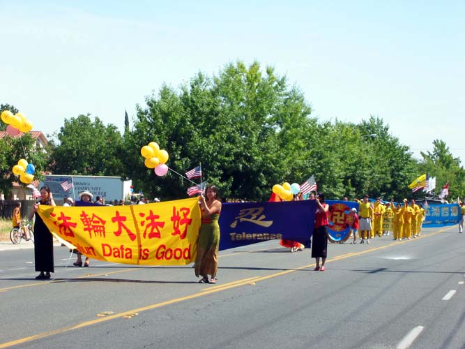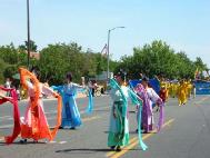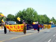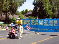 法轮功的队伍最前面是“法轮大法好”和“真善忍”横幅,接着是七仙女舞蹈队,后面是大幅法轮图形和功法示范方阵,接下来是请帮助营救在中国受迫害的亲人标语,随后有小弟子的推车和法轮大法洪扬五洲四海横幅。30多人组成的队伍,井井有条。让所有的观众耳目一新,纷纷赞许。