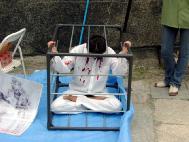 当第一批目睹这一迫害场景的游客来到这一演示现场后,面对这一场景即惊愕不已。他们起初以为学员们在演出一种自编的戏剧。当学员们向他们解释道,这正是目前每天在中国发生着的真实场面后,许多游客,特别是一些西方以及一些来自亚洲地区的游客不断的叹气、摇头。他们表示,在人类已经進入了二十一世纪的文明之后,居然还会出现这种类似中世纪的野蛮行为,这是无论如何不能容忍的。