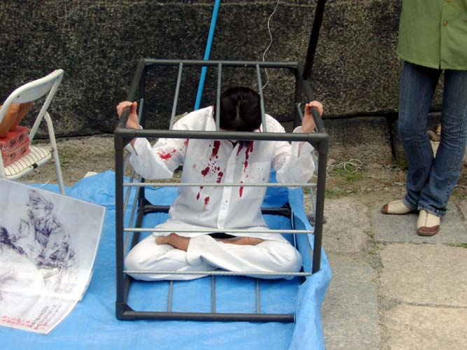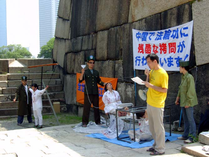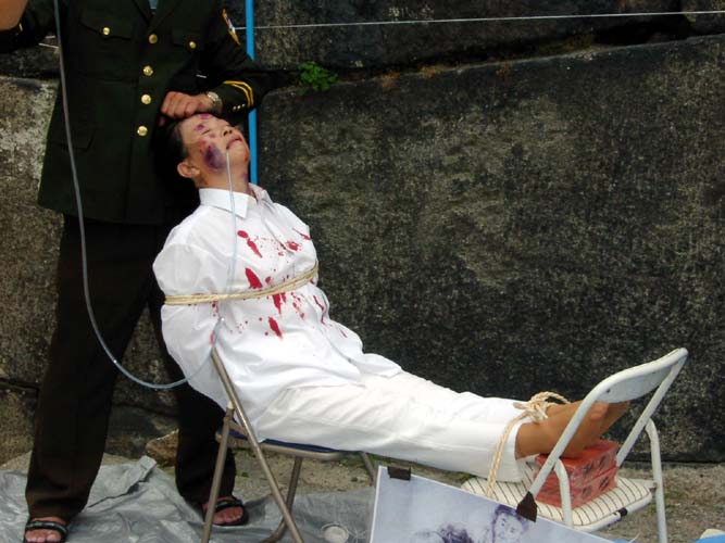 一大早学员们摆开了演示道具后,扮演受酷刑折磨的中国大陆学员与扮演实施酷刑的警察的学员随即進入了角色。